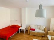 ...apartment with terrace in Schwabing. Ground floor. The attractive and stylish living-/bedroom offers a daybed, dining area for up to 3 persons as well as a wardrobe. From here access to the furnished terrace. The separate built-in kitchen is equipped...